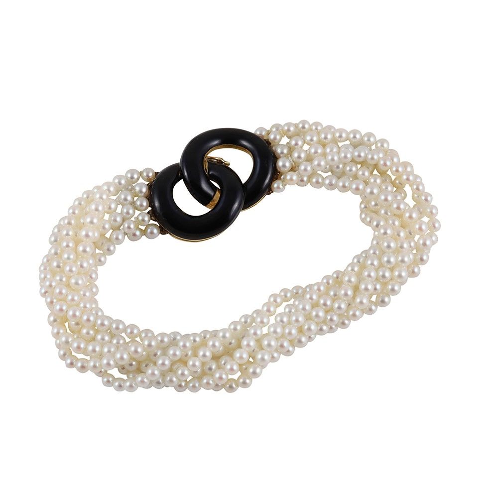 'torchon' composto da otto fili di perle coltivate con chiusura a doppio anello in oro giallo e smalto nero. Lunghezza 20 cm ca.