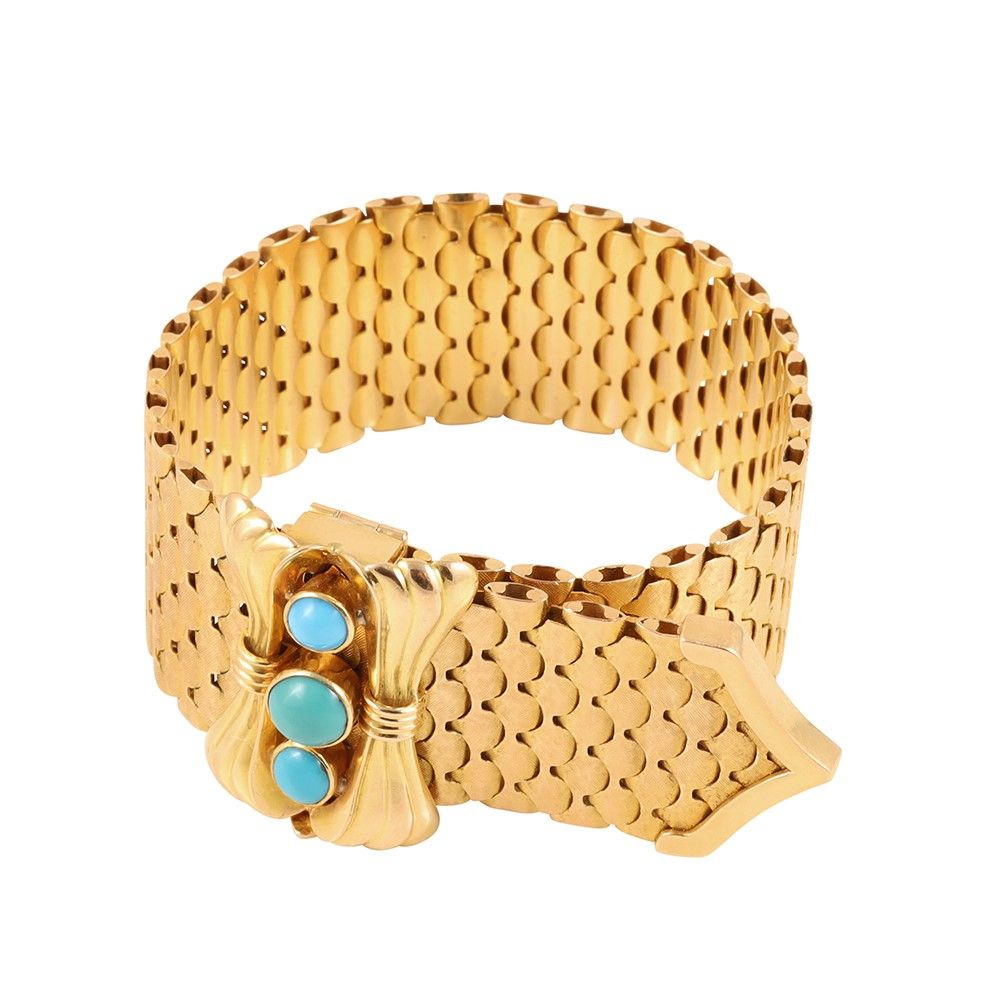 in oro giallo a fascia satinata, con fermezza a fibbia ornata da una turchese e due in paste di turchese cabochon, gr. 79,8. Lunghezza regolabile