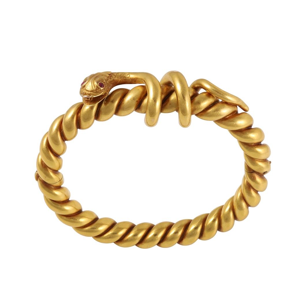 rigodo a torchon, realizzato in oro giallo, sormontato da un serpente con testa cesellata e rubini per occhi, gr. 48,8. Misura 19 cm ca.