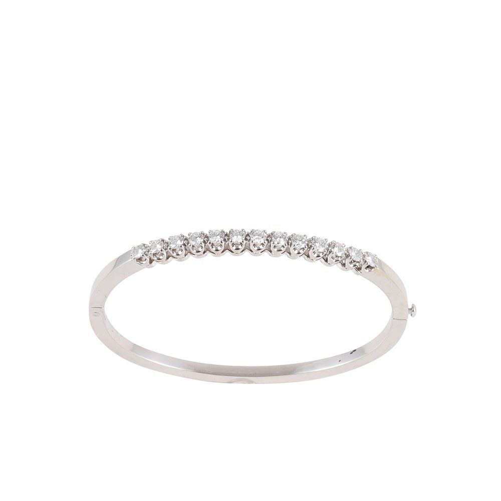rigido in oro bianco con parte anteriore ornata da brillanti disposti in linea del peso complessivo di 1,30 ct ca., gr. 17,3. Misura 16 cm ca.