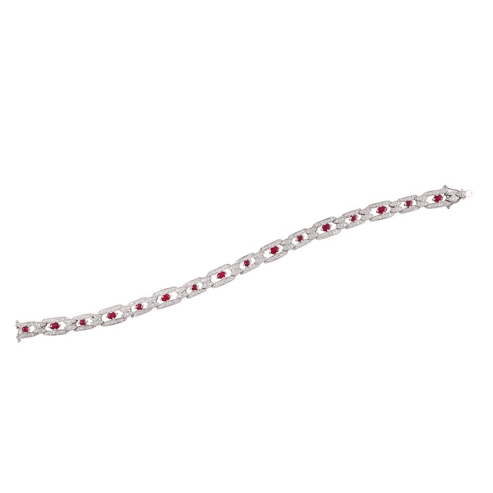 in oro bianco a motivi geometrici in brillanti (uno mancante) e rubini, gr. 21,6. Lunghezza 19 cm