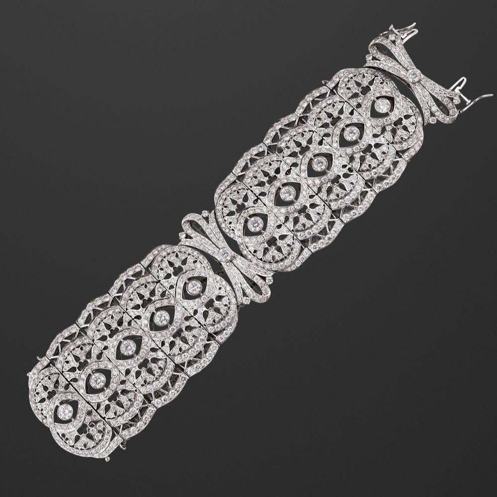 a larga fascia traforata, realizzato in oro bianco e impreziosito da brillanti del peso complessivo di 29 ct ca., composto da due elementi ovali polilobati raccordati da motivi nastriformi, gr. 137,2. Lunghezza 19 cm