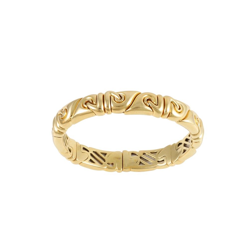 semirigido, in oro giallo a motivi geometrici, gr. 58,8. Corredato da astuccio originale. Misura 16 cm (regolabile) Firmato: Bvlgari