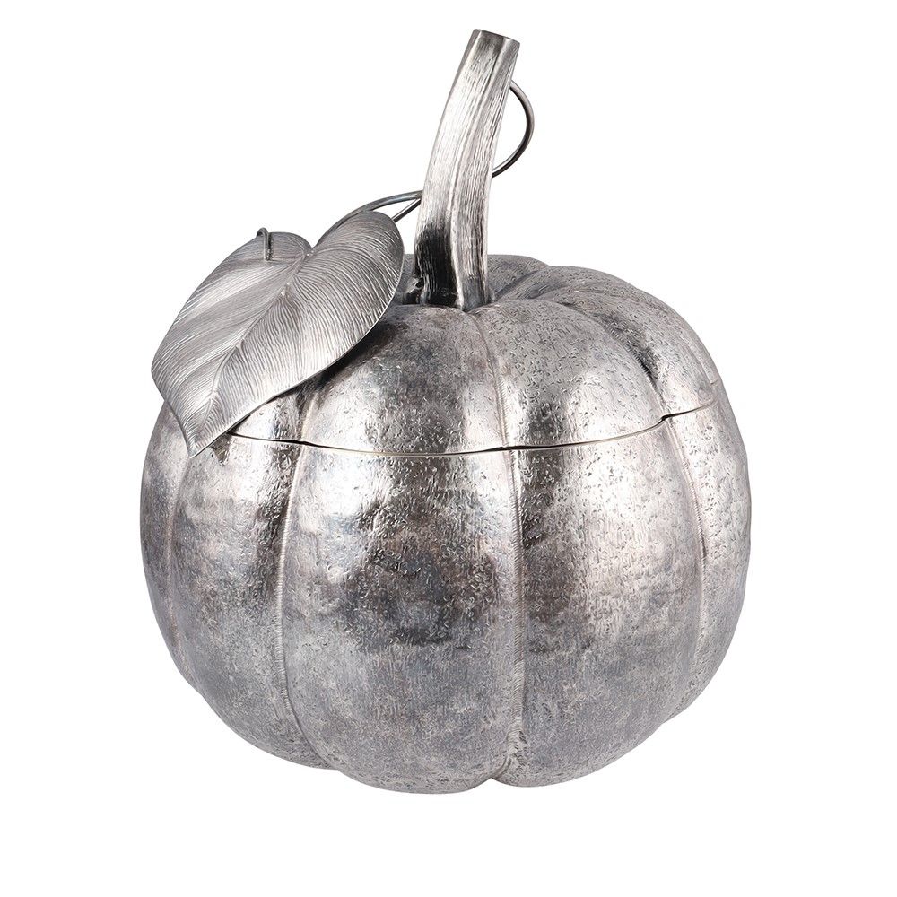in argento 925 e interno vermeille, a forma di zucca con coperchio fogliato, gr. 1.340 ca. Corredato da scatola originale. Diametro 20 cm, altezza 25 cm ca. Punzone: F.C. Numerario: 39 MI (Cacchione Fratelli s.r.l. - Milano)