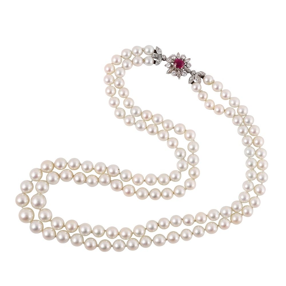 a due fili di perle coltivate poste in leggera gradazione 10 / 6,5 mm, fermezza in oro bianco con rubino contornato da diamanti taglio navette e a brillante. Lunghezza 52 cm