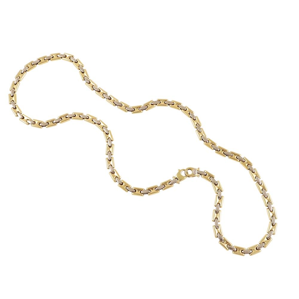 in oro giallo e bianco a maglie rettangolari, gr. 55,6. Lunghezza 61 cm ca. Firmata: Tris Gold