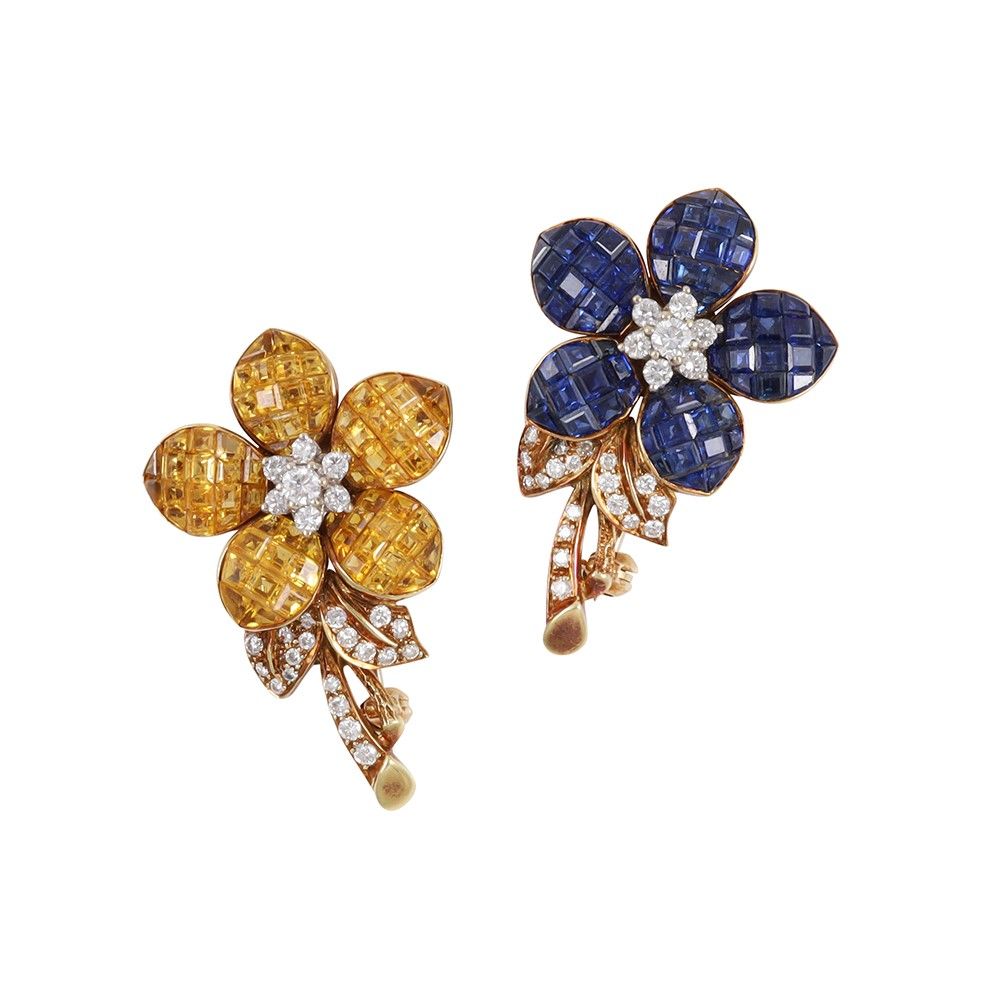 realizzate in oro giallo e bianco, a guisa di fiore fogliato, rispettivamente con petali in zaffiri e corindoni gialli taglio carré 'serti invisible', impreziosite da brillanti, gr. complessivi 17,8. Dimensioni 3,5 x 2,3 cm ca. Firmate: Sabbadini made in italy
