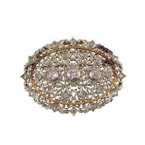 a forma ovale traforata, realizzata in oro bianco e giallo, impreziosita da tre diamanti taglio antico europeo [..]