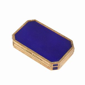 a forma ottagonale incisa a motivi vegetali realizzata in oro giallo e smalto blu guilloché (lievi mancanze), [..]