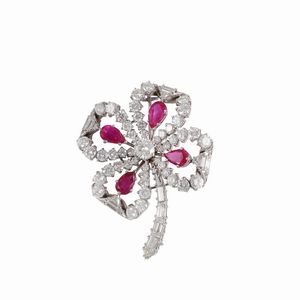 quadrifoglio in oro bianco, impreziosito diamanti taglio a brillante, baguette e triangolare del peso complessivo [..]