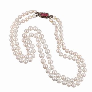 a due fili di perle coltivate poste in gradazione 10,5 / 7,5 mm, con fermezza in oro e argento con diamanti e [..]