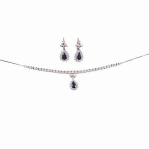 in oro bianco, composta catenina ornata al centro una rivière di brillanti con zaffiro a goccia pendente e orecchini [..]