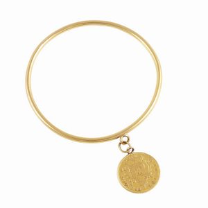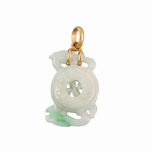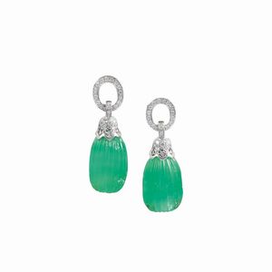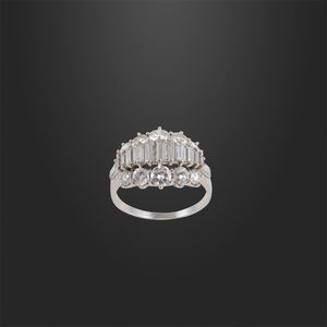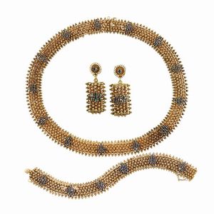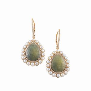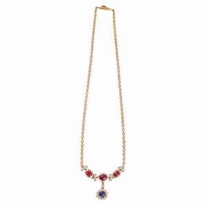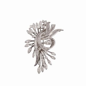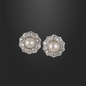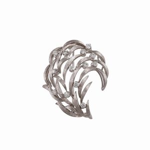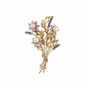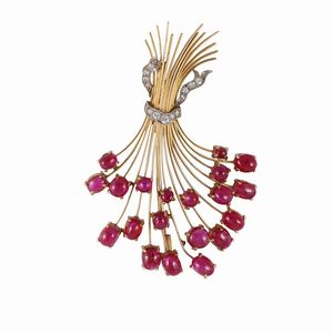 in argento e oro, d'ispirazione floreale ornata da rubini, diamanti taglio a rosa e piccole perle pendenti, gr. [..]
