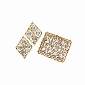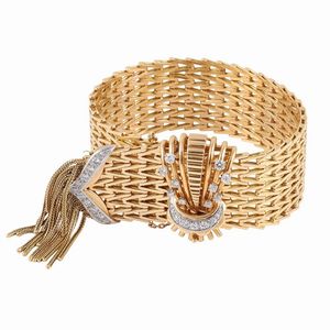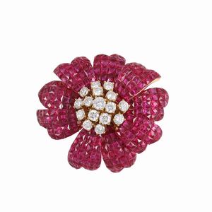 in oro giallo a maglie tonde, inframezzato da perle coltivate di cui una pendente terminale punteggiata da rubini, [..]