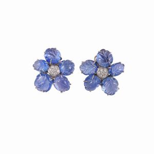 a clip in oro bianco raffiguranti un fiore con petali in zaffiri taglio cabochon incisi e pistillo in pavé di [..]