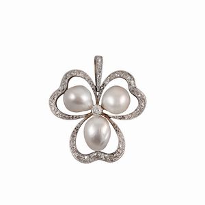 trifoglio in platino e oro, ornato da tre perle naturali d'acqua salata 8,57 / 10,57 x 8,18 mm ca. e diamanti [..]