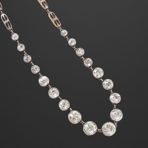 in platino e oro giallo, composto da elementi ovali traforati, evidenziato al centro da diamanti taglio antico [..]