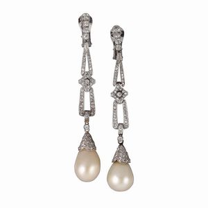 a clip, pendenti in platino a disegno geometrico, con perle naturali d'acqua salata a forma di goccia e diamanti, [..]