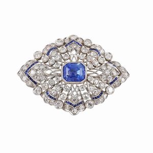 in platino a forma di losanga, finemente traforata, evidenziata al centro da uno zaffiro ottagonale del peso di [..]