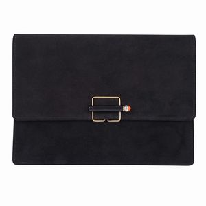 a forma rettangolare, in suede nera, impreziosita da una chiusura-gioiello in oro e argento, lacca e corallo cabochon [..]