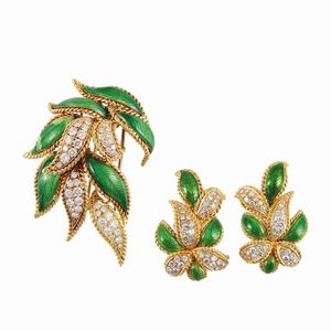 in oro giallo d'ispirazione vegetale composta da spilla e orecchini a clip, ornati da brillanti e smalto verde [..]