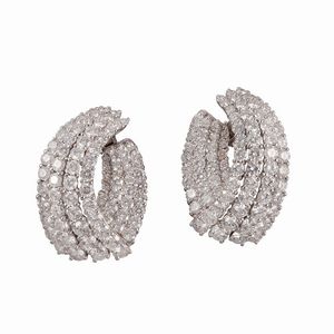 realizzati in oro e platino a volute, impreziositi da rubini e diamanti, gr. complessivi 58,9. Dimensioni 6,5 [..]