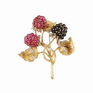 ramage realizzato in oro giallo e bianco con foglie incise ornate da diamanti, lamponi e mora in rubini e onici [..]