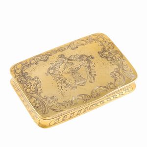 in oro giallo a corpo rettangolare incisa con motivi a volute e stemma araldico, gr. 120,2. Dimensioni 8 x 6 h [..]