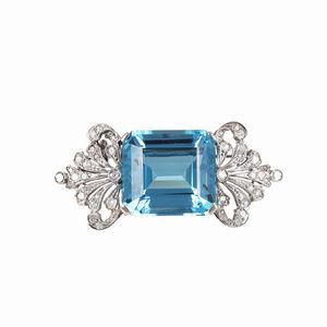 in oro bianco con acquamarina rettangolare con angoli tronchi del peso di 26 ct ca., affiancata da motivi traforati [..]