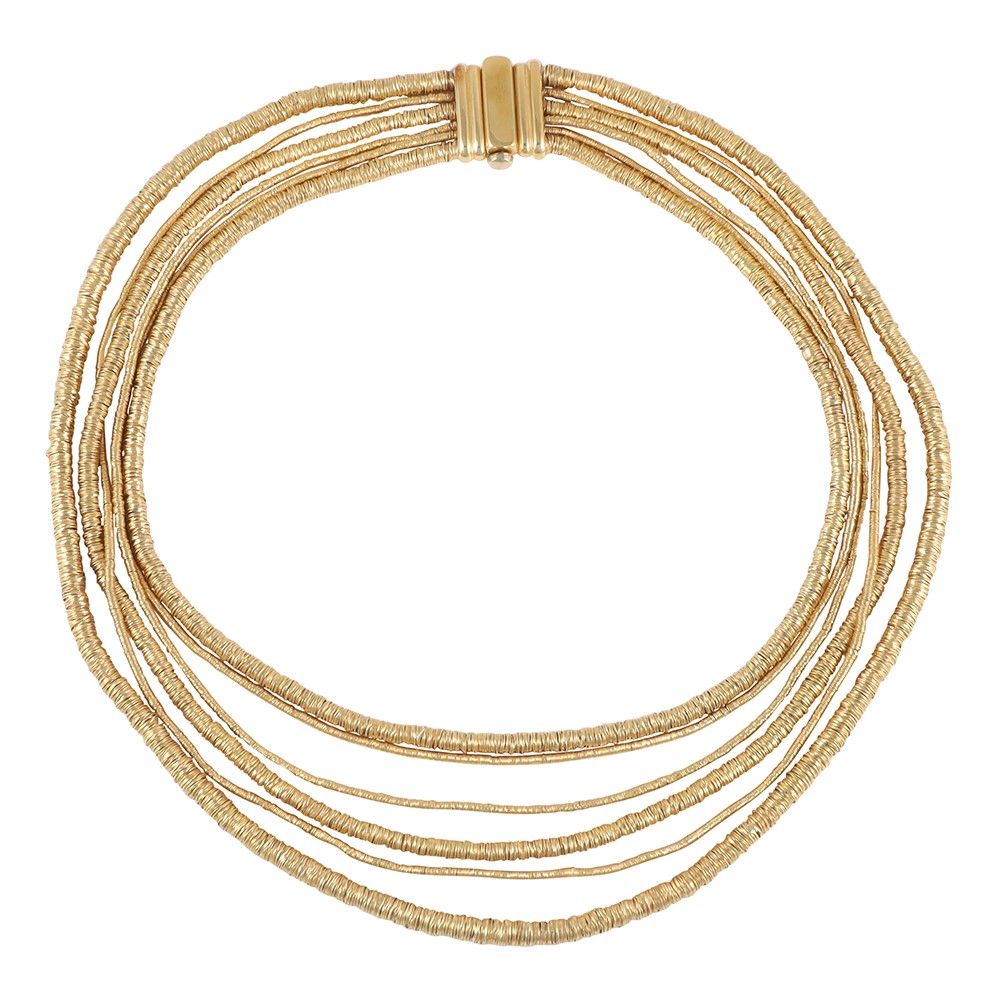 in oro giallo composto da sei fili di cordoncino, formati da dischetti di diverse misure, gr. 183,3. Lunghezza 43 cm Firmato: Orlandini BREV 2