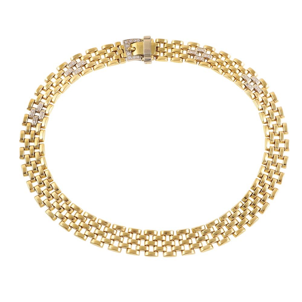 in oro giallo a maglia 'panther' con fermezza a guisa di fibbia e pietre sintetiche, gr. 77,3. Lunghezza 44 cm ca.