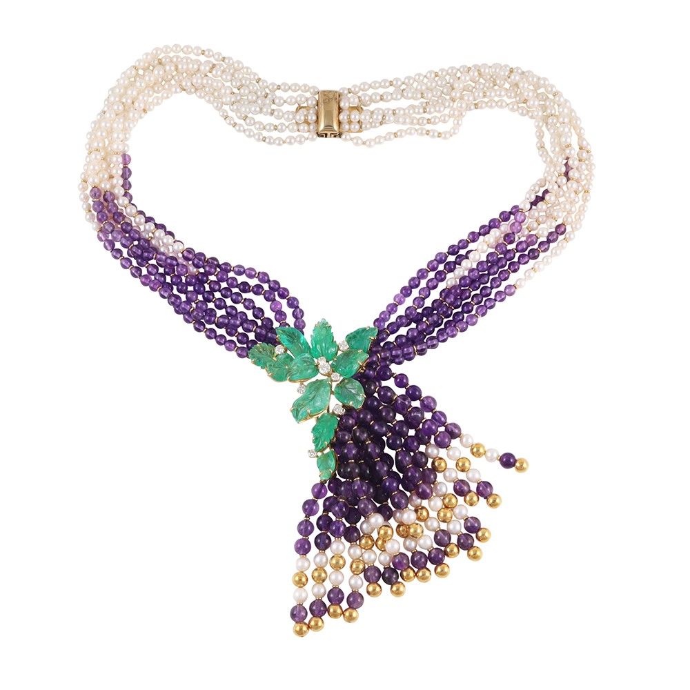 'torchon' composto da sette fili di perle coltivate e sfere di ametista, alternate a rondelle in oro, la collana la centro è impreziosita da un motivo formato da foglie incise di smeraldo (lieve mancanza) e brillanti che trattengono un ciuffo di perle coltivate, sfere in ametista e oro giallo. Lunghezza 40 cm ca.