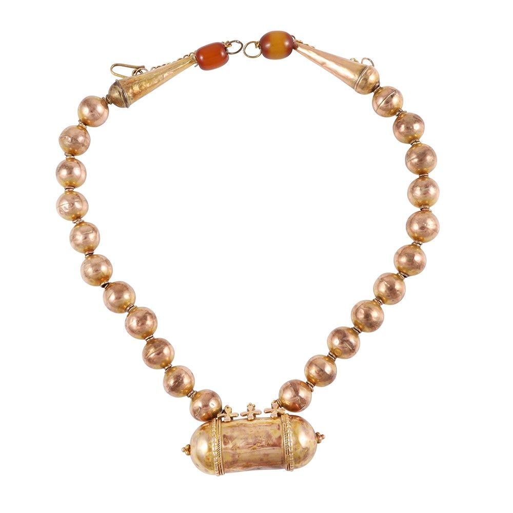 di gusto etnico a un filo di boule con amuleto a forma cilindrica, in oro a titolo basso, gr. 20,6. Lunghezza 44 cm