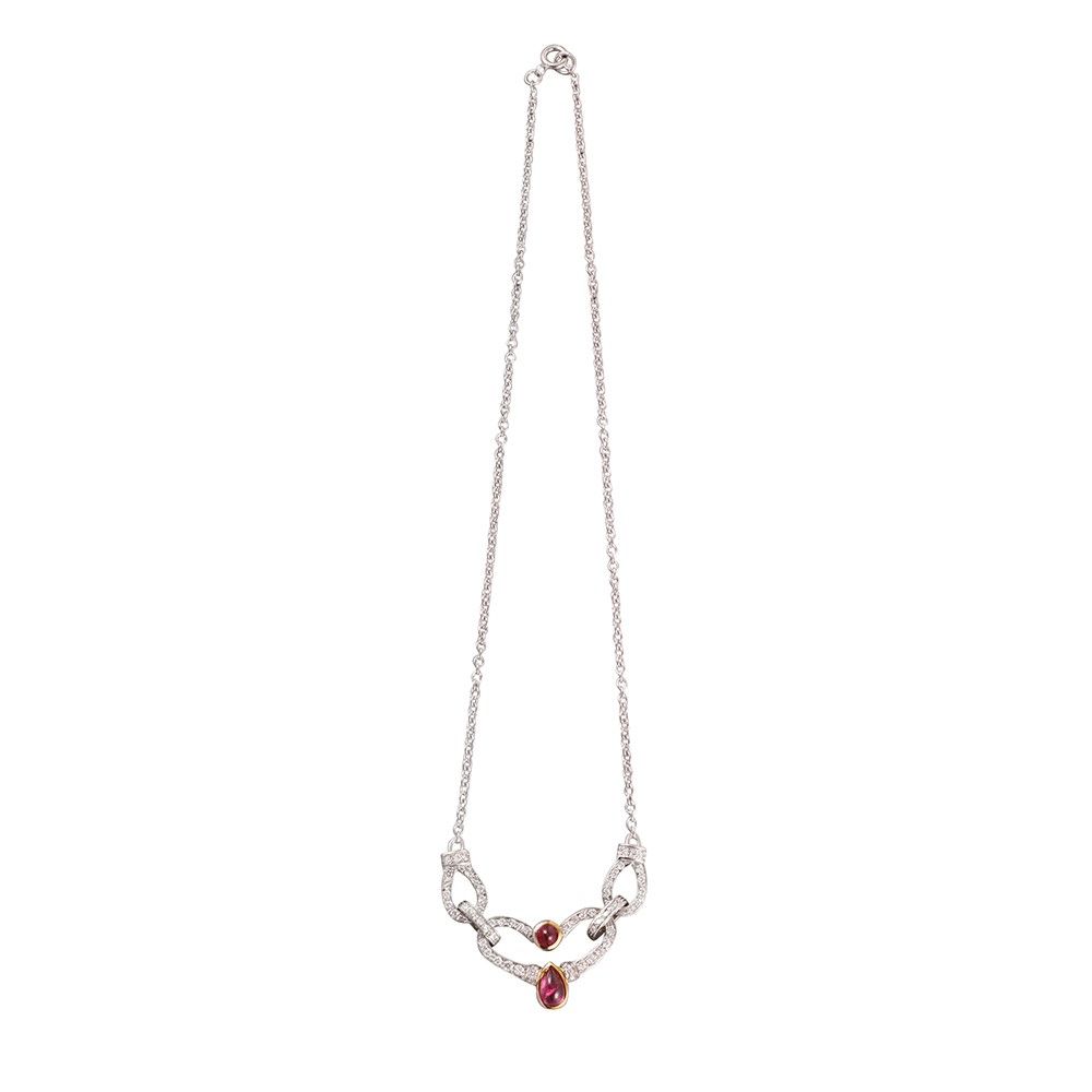 in oro bianco e giallo con motivo centrale a cuore stilizzato, ornato da brillanti e rubini taglio cabochon, sostenuto da catenella, gr. 10,6. Lunghezza 38 cm Firmato: Corbetta