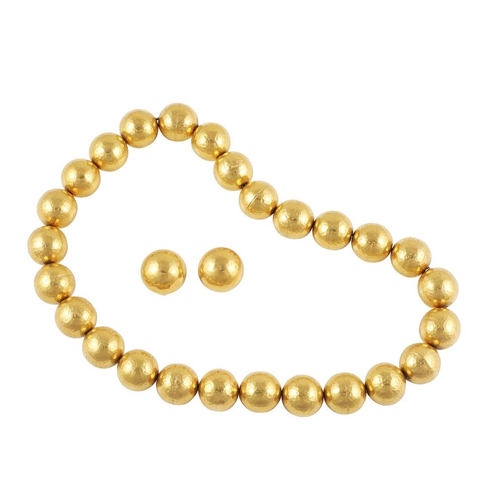 formato da sfere in oro giallo a lavorazione martellata trattenute da catenina. Orecchini a mezza sfera abbinati, gr. complessivi 145,8. Lunghezza 46,5 cm Girocollo firmato: van der Shoot (Vitobello Maria Luisa)