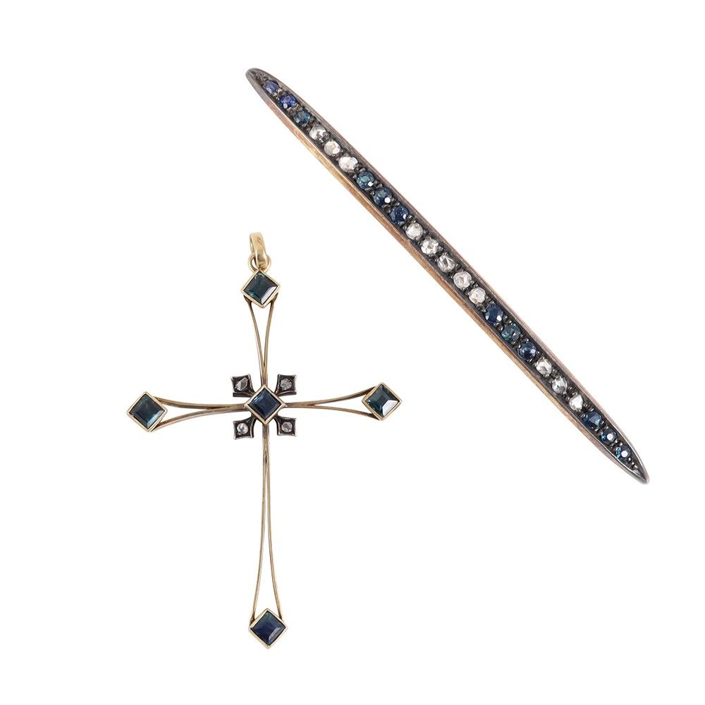 in oro e argento, composto da spilla a barretta percorsa da zaffiri e diamanti taglio a rosa e da pendente a croce ornata da zaffiri taglio carré e piccoli diamanti a rosa, gr. complessivi 16,9. Lunghezza spilla 8,5 cm ca., pendente 6 x 4 cm ca.