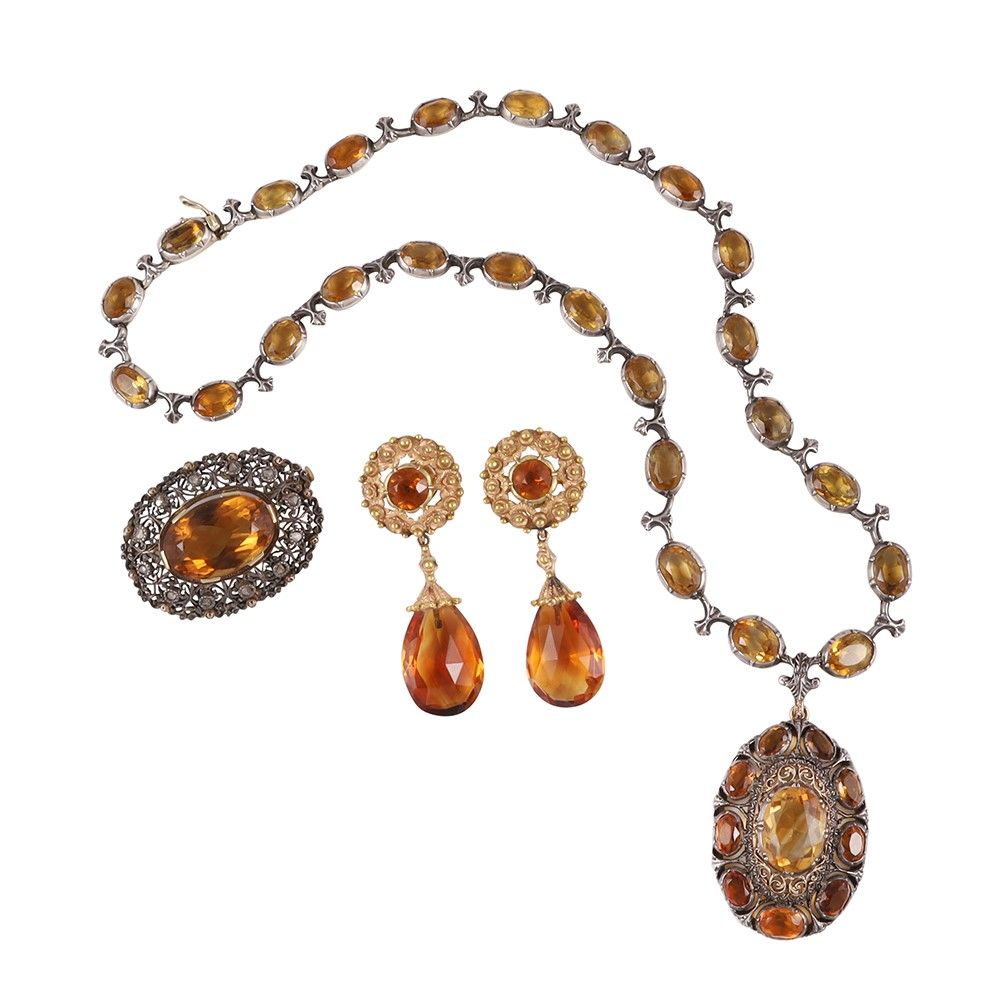 composto da una collana con pendente a rosone traforato staccabile, realizzati in argento, oro e quarzi; una spilla ovale in argento e oro traforata con quarzo e diamanti taglio a rosa e un paio di orecchini pendenti in oro giallo con quarzi tondi e taglio briolette, gr. complessivi 73. Lunghezza collana 42 cm.