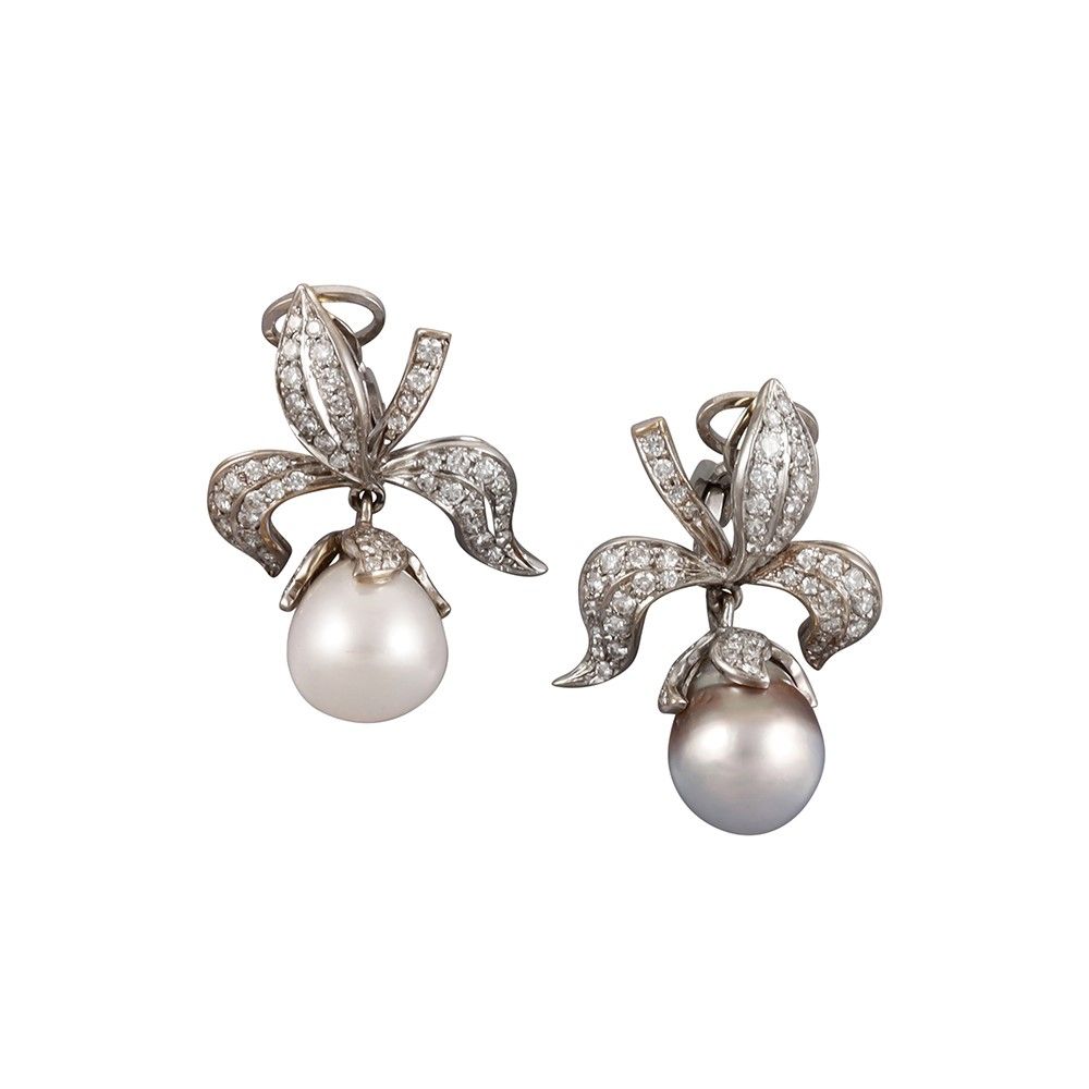 clip in oro bianco a motivo floreale in brillanti del peso complessivo di 1,30 ct ca., ciascuno con perla coltivata sospesa bianca e grigia, gr. 12,9. Lunghezza 3 cm ca.