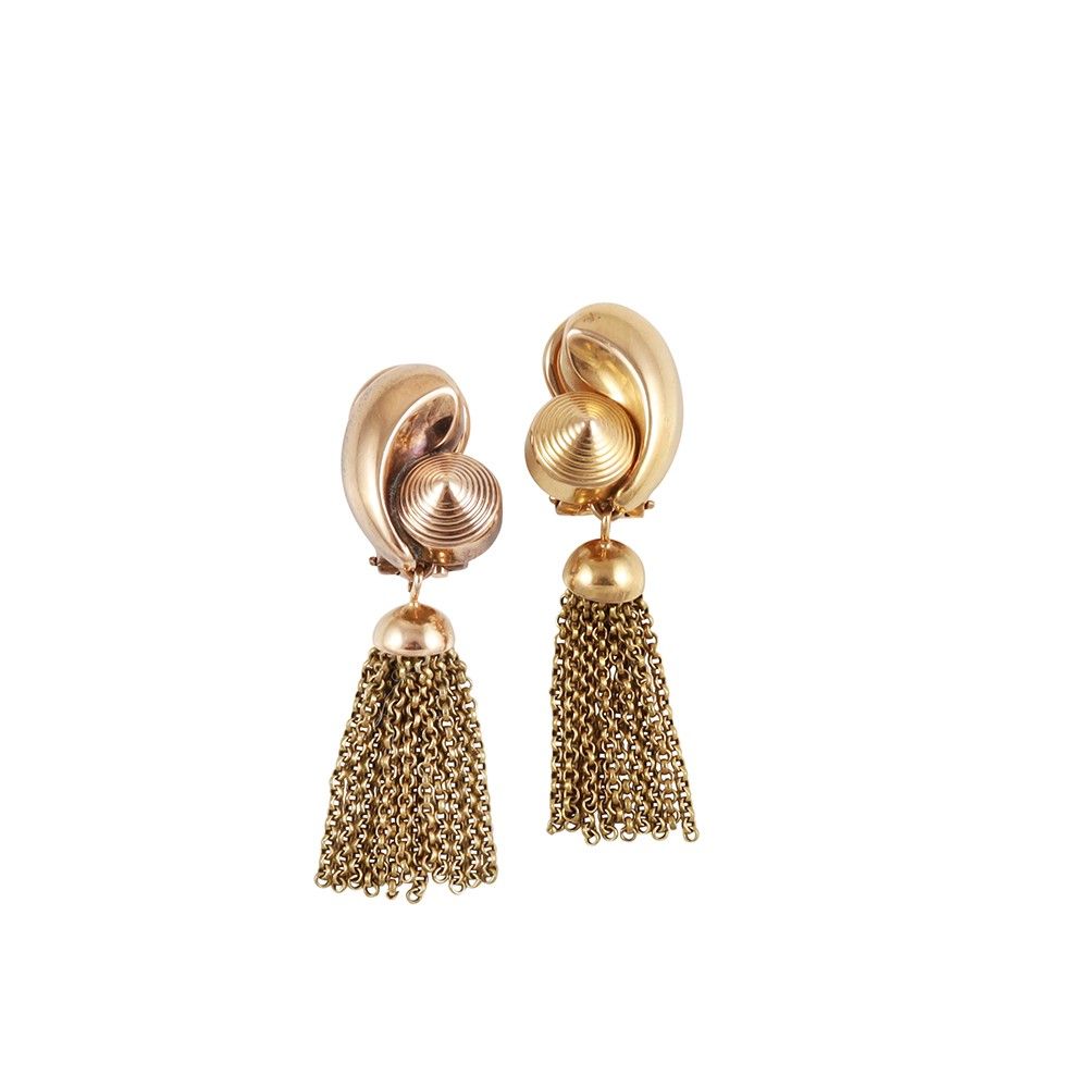 a clip pendenti, in oro rosa, ciascuno con motivo superiore stilizzato e nappina con catenelle, gr. 10,5. Lunghezza 4,2 cm ca.