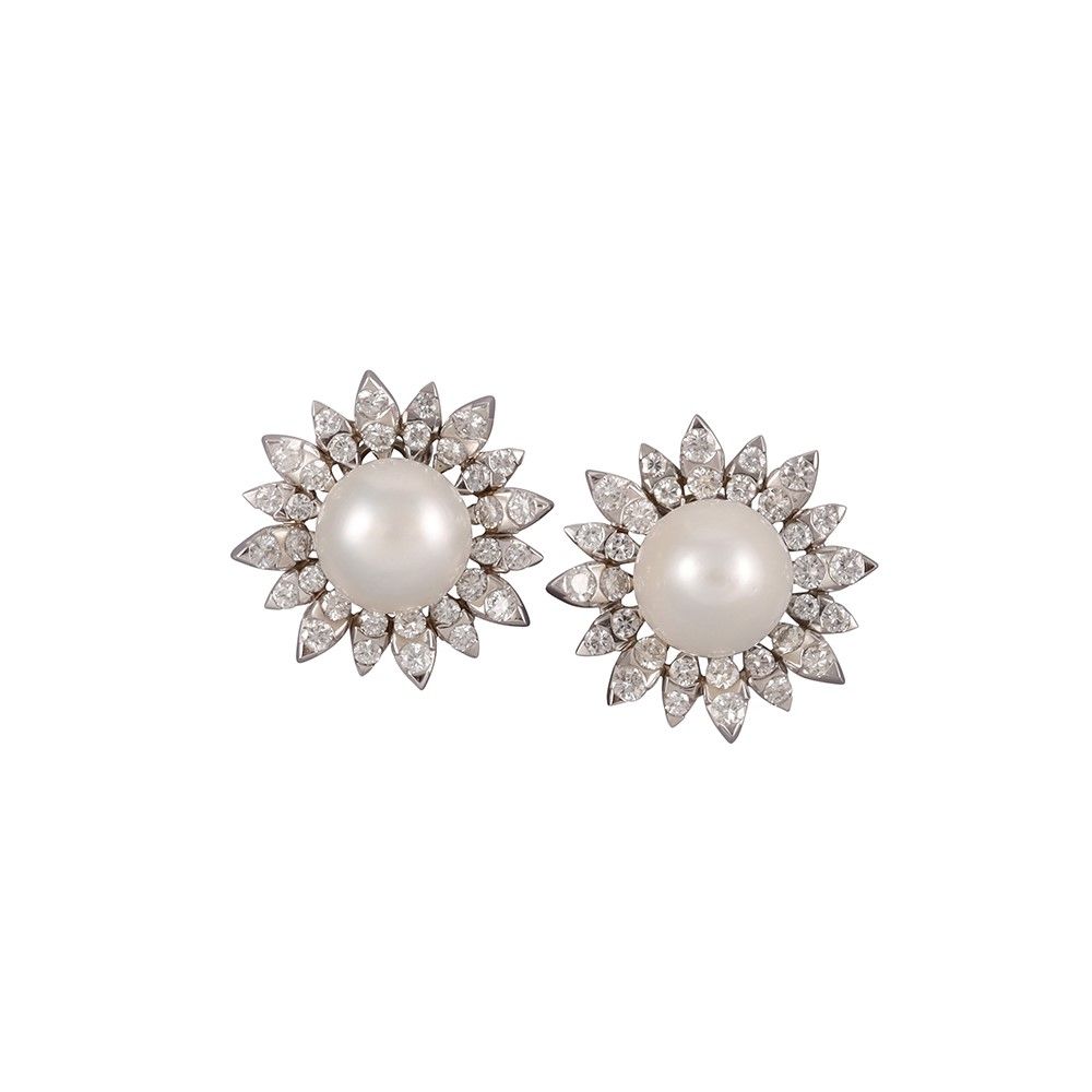 a clip in oro bianco, a guisa di fiore con perle coltivate e brillanti del peso complessivo di 3,20 ct ca., gr. 24,3. Diametro 2,7 cm ca.