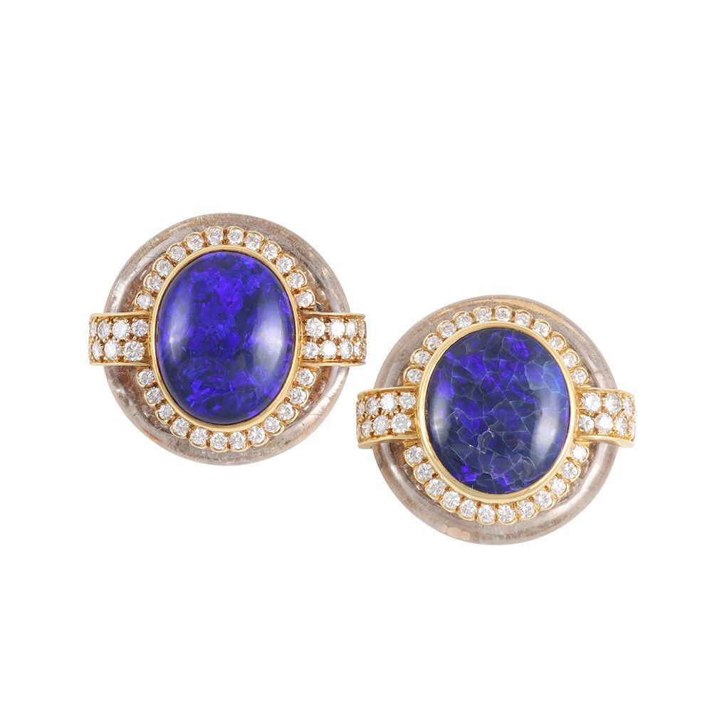 clip a forma circolare in oro giallo con quarzo ialino, opale nero (fêlure) e brillanti ad ornamento del peso complessivo di 2,50 ct ca., gr. 48,3.  Diametro 3 cm ca.