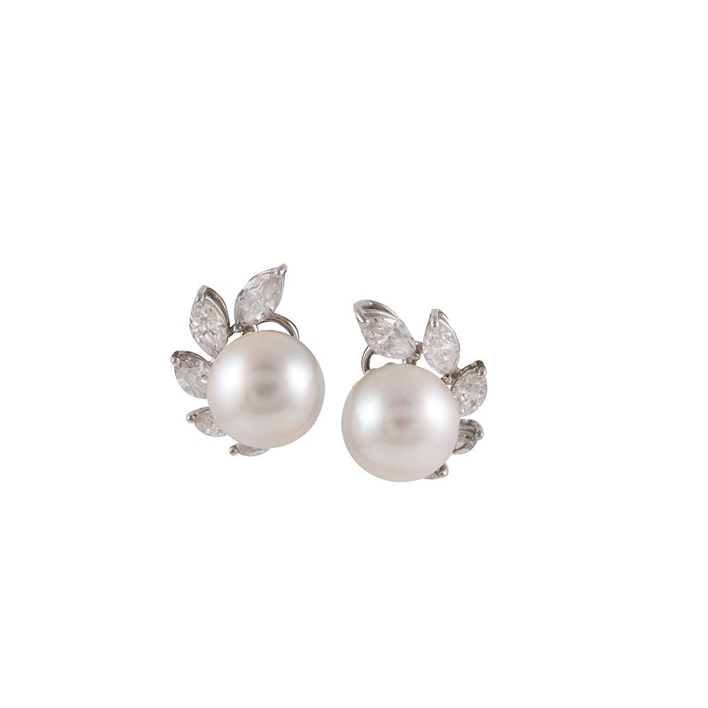 in oro bianco con perle coltivate 9,5 mm, impreziositi da diamanti taglio navette, gr. 6,3.