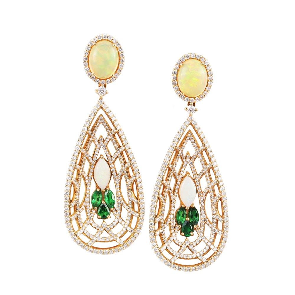 pendenti in oro rosa, ornati da brillanti del peso complessivo di 2,80 ct ca., opali nobili e smeraldi. Ciascuno con un motivo a goccia traforato sospeso, gr. 15,5.