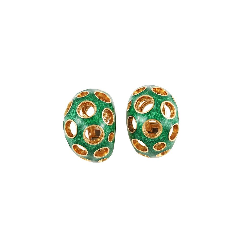 a clip, in oro giallo e smalto verde, bombati con tondi traforati, gr. 24,9. Dimensioni 2,3 x 1,7 cm ca. Firmati: Kutchinsky