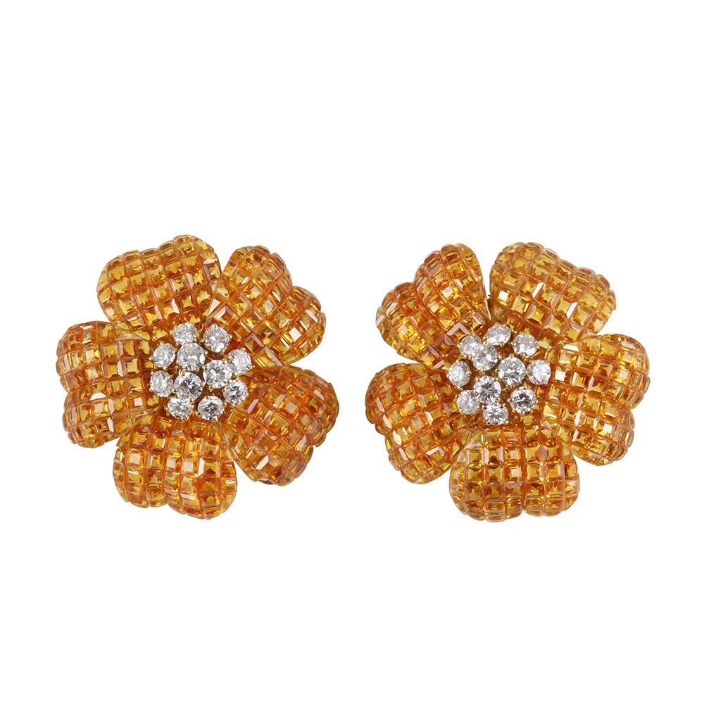 realizzati in oro giallo, raffiguranti fiori con petali in pavé di corindoni gialli carré 'serti invisible', al centro brillanti disposti a rosone del peso complessivo di 3 gr. 44,2. Diametro 3,7 cm ca. Numerario: 963 MI (Sabbadini s.r.l. - Milano) Nota: orecchini a clip predisposti per l’eventuale utilizzo con perno (due zaffiri mancanti)
