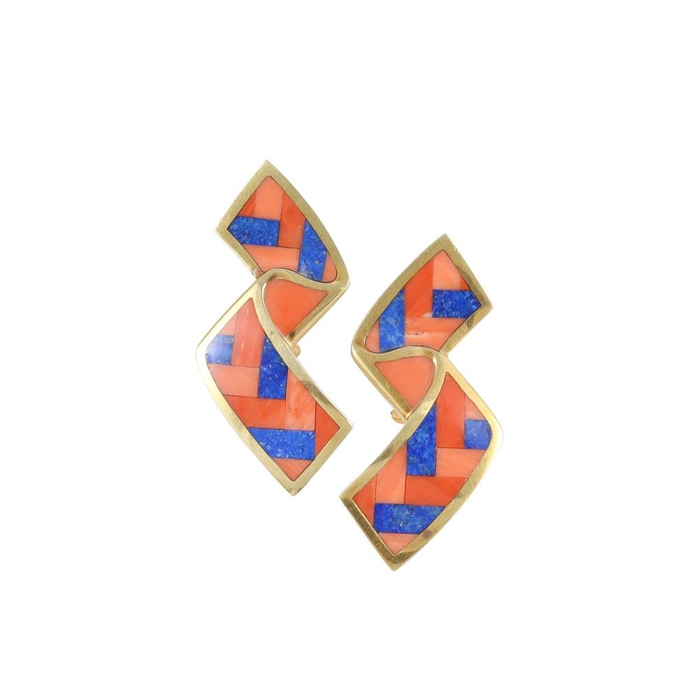 in oro giallo a nastro con motivo geometrico in corallo e lapislazzuli, gr. 17,6. Dimensioni 4,8 x 2,5 cm ca.
