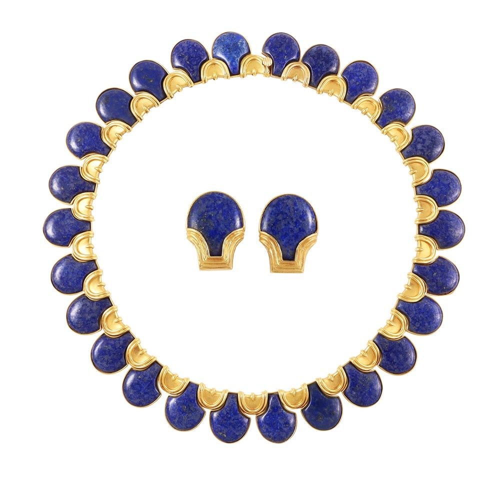 composta da orecchini e girocollo in oro giallo formati da elementi arcuati in oro giallo e lapislazzuli, gr. complessivi 103,9. Lunghezza 40 cm, dimensione orecchini 2 x 1,5