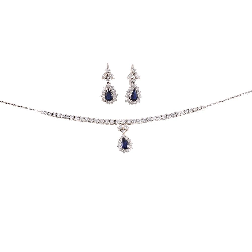 in oro bianco, composta catenina ornata al centro una rivière di brillanti con zaffiro a goccia pendente e orecchini 'en suite', gr. complessivi 22,2. Brillanti del peso complessivo di 5 ct ca. Lunghezza 47 cm