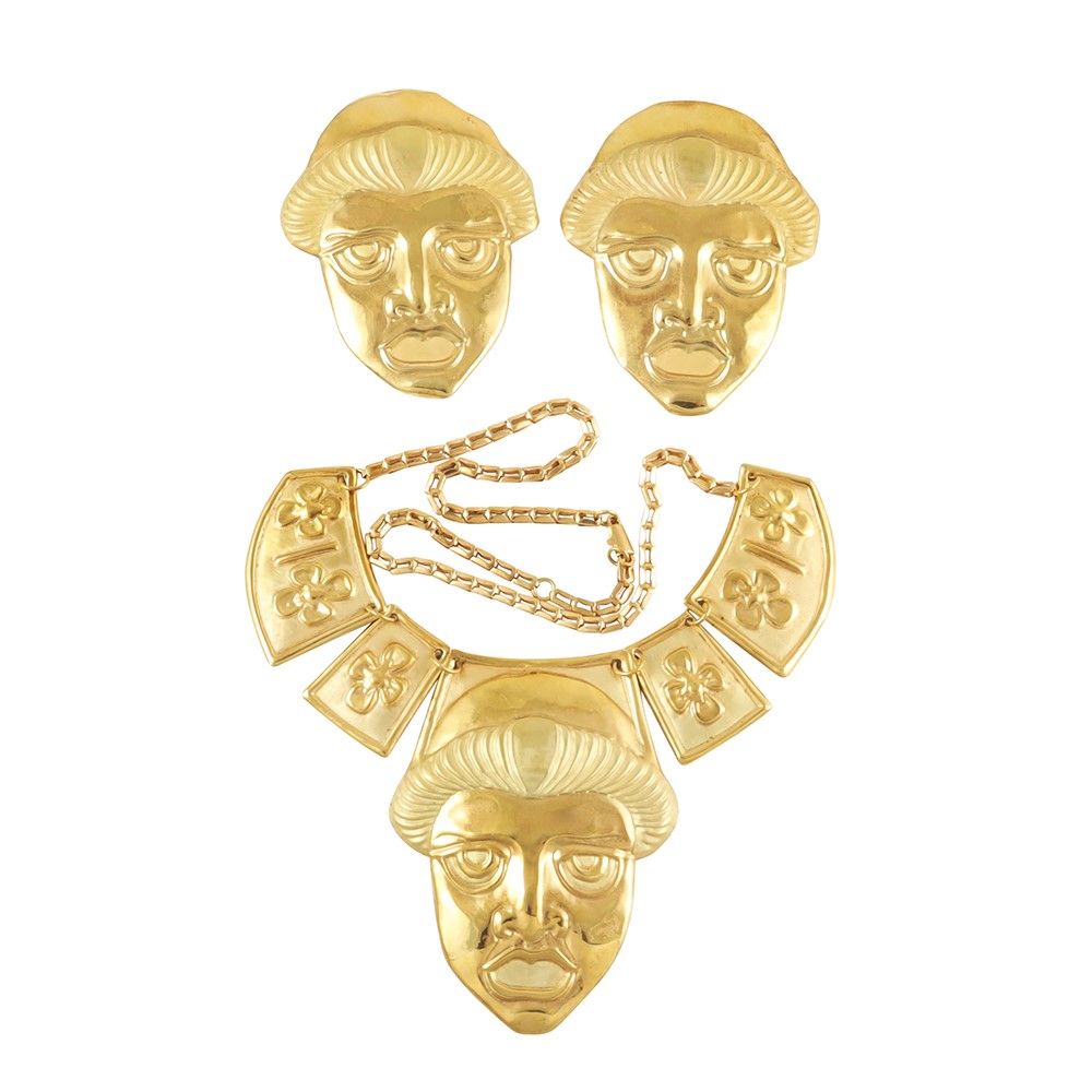 composta da collana e orecchini con motivi a mascherone in lastra d'oro giallo, gr. complessivi 31,5. Lunghezza 42 cm