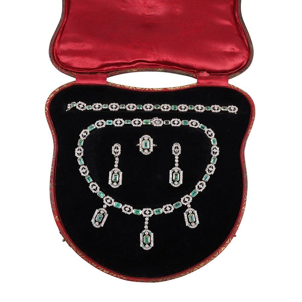 realizzata in oro bianco e giallo, composta da girocollo evidenziato al centro da tre pendenti, bracciale, anello e orecchini a disegno geometrico, impreziositi da smeraldi del peso complessivo di 25 ct ca e brillanti del peso complessivo di 7 ct ca., gr. complessivi 85,2. Corredata da custodia originale. Lunghezza girocollo 40 cm, bracciale 19 cm, orecchini 4,5 cm Misura anello 16